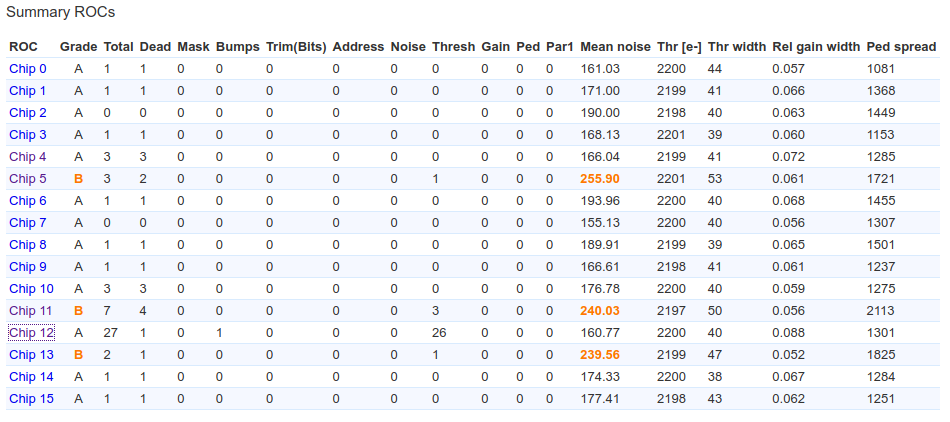 3) March 5: Grade C due to trimming failure in ROC1 for 189 pixels at +10C, at -20C trimming failure in ROC1 for 157 pixels