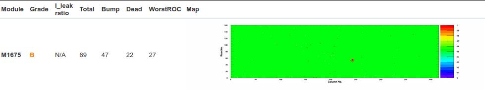This module was graded C only at second FT at-20C, the first FT at -20C and FT at +10C give grade B. Massive trimming failure of pixels in ROC7 was not observed.